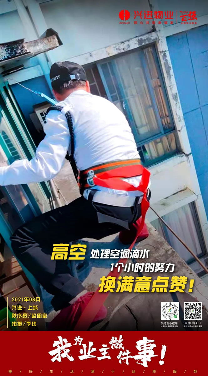 興進(jìn)·上城物業(yè)秩序班長李瑋與隊員趙周富,頂著一個多小時的烈日,汗流浹背地幫助業(yè)主更換空調(diào)冷凝排水管;